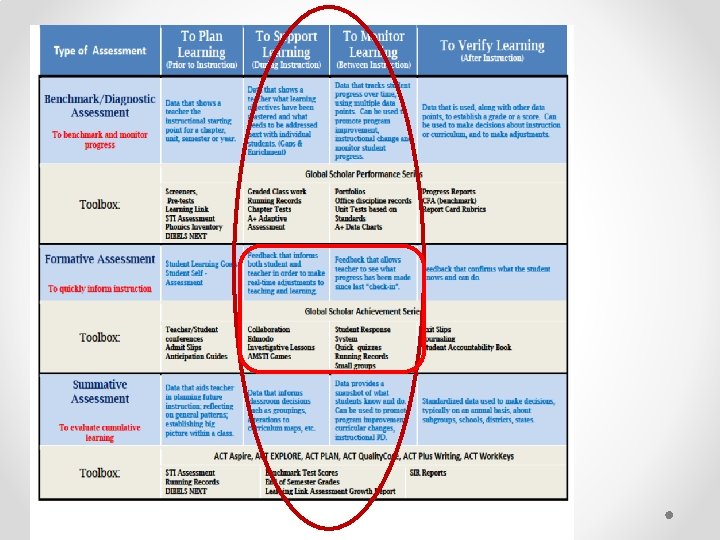 Formative Assessment • Assessment for Learning • Check for Understanding • Guide for teacher in future instruction • Helps differentiate instruction Summative Assessment • Assessment of Learning • Measure how much students know up to a certain point. • Provide grades and accountability
