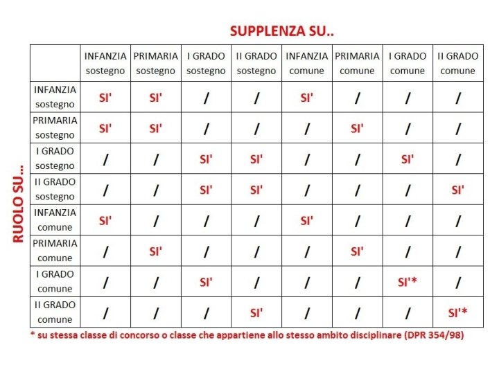 • la supplenza su posto di sostegno per la scuola dell’infanzia e per la scuola primaria è valida indifferentemente ai fini dello svolgimento del periodo di prova su posto di sostegno per la scuola dell’infanzia o primaria; • la supplenza su posto di sostegno per la scuola secondaria di primo e di secondo grado è valida indifferentemente ai fini dello svolgimento del periodo di prova su posto di sostegno per la scuola secondaria di primo e di secondo grado; • la supplenza su posto di sostegno è valida ai fini dello svolgimento del periodo di prova anche su posto comune e viceversa, nel medesimo ordine e grado di scuola.