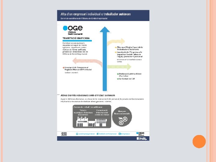 Empresa individual Empresari individual § Persona física que realitza en nom propi i mitjançant una empresa una activitat comercial, industrial o professional. §Nombre de socis : màxim i mínim d´un § Personalitat física. § Responsabilitat il·limitada. § No fa falta un capital mínim. § Raó social: el titular. § Tributa mitjançant IRPF. § S´ha de tramitar a l´oficina de gestió empresarial (OGE) §Anar al Registre Mercantil Provincial per inscriure l´empresa , això és voluntari § Anar a la SS a donar-se d´alta en el RETA i gestionar l´alta de treballadors § L´OGE fa les gestions del registre d´entrada dels expedients de patents i marques que tramitaran a l´OEPM. Si compleix amb els requisits establerts, el moment de presentació davant de l´OGE té validesa legal pel naixement del dret de prioritat. § Normativa aplicable: el Còdic de Comerç en materia mercatil i el Civil, pel que fa als deures i obligacions.