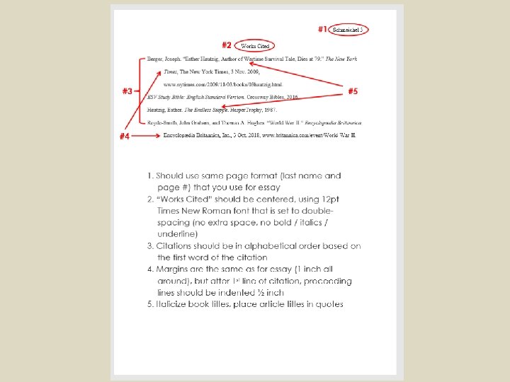 Works Cited: Author 1. AUTHOR. 2. TITLE OF SOURCE. 3. TITLE OF CONTAINER, 4. OTHER CONTRIBUTORS, 5. VERSION, 6. NUMBER, 7. PUBLISHER, 8. PUBLICATION DATE, 9. LOCATION.