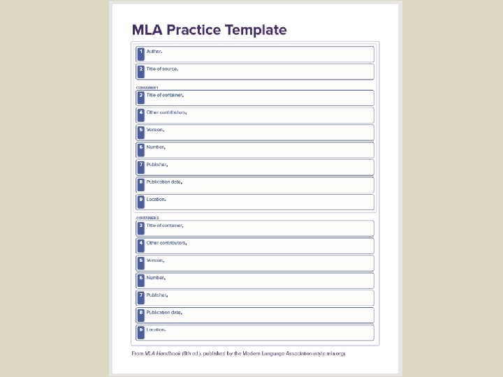 Works-cited List: Number 1. AUTHOR. 2. TITLE OF SOURCE. 3. TITLE OF CONTAINER, 4. OTHER CONTRIBUTORS, 5. VERSION, 6. NUMBER, 7. PUBLISHER, 8. PUBLICATION DATE, 9. LOCATION. If your source uses another numbering system, include the number in your entry, preceded by a term that identifies the kind of division the number refers to.
