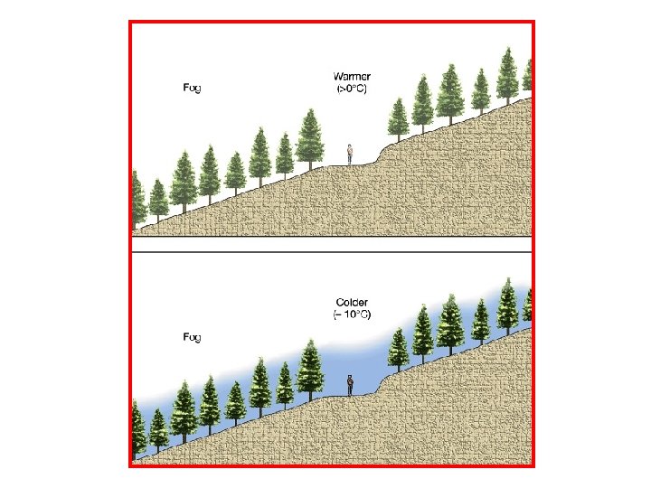 Fog • Fog, generally considered an atmospheric hazard, is a cloud with its base at or very near the ground. • Fogs formed by cooling include: § radiation fog (from radiation cooling of the ground adjacent air), § advection fog (when warm and moist air is blown over a cold surface), and § upslope fog (created when relatively humid air moves up a slope and cools adiabatically).