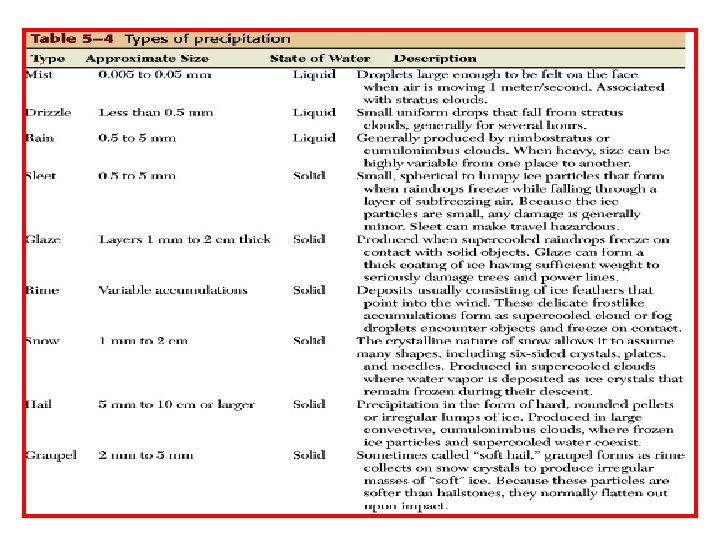 Precipitation Types • The two most common and familiar forms of precipitation are: § rain (drops of water that fall from a cloud and have a diameter of at least 0. 5 millimeter) and § snow (precipitation in the form of ice crystals or, more often, aggregates of ice crystals).