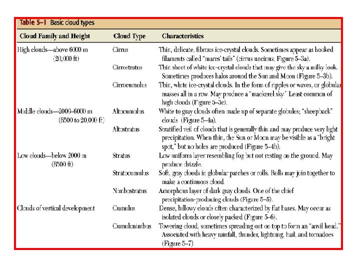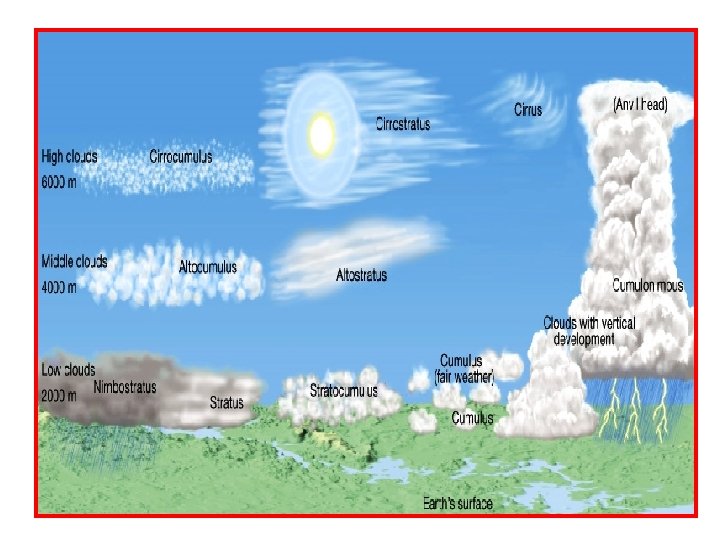 Cloud Heights • Cloud heights can be either: § high, with bases above 6000 meters (20, 000 feet), § middle, from 2000 to 6000 meters, or § low, below 2000 meters (6500 feet). • Based on the two criteria, ten basic cloud types, including such types as cirrostratus, altocumulus, and stratocumulus, are recognized.