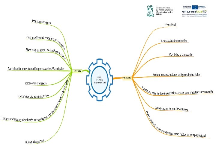 Herramientas para el cambio Diálogo sí, pero con retorno Fue una de las cuestiones en las que hicieron más énfasis. A la mayoría de ellos les parecía muy bien la organización de este tipo de foros para trasladar sus inquietudes. Otros, especialmente a las grandes asociaciones SEA y Cámara de Comercio, eran un poco más escépticos porque, según ellos, ya se había hecho otras veces y se había quedado en “agua de borrajas”. En cualquier caso, todos insistían en la importancia del retorno, de la devolución de el trabajo que habían realizado ellos en la sesión. Qué se ha recogido y que se va a hacer, “porque otras veces no se ha hecho”. Indicadores de eficiencia Muchos de los presentes en la Sesión de Escucha demandaban un trabajo más profesional por parte del Ayuntamiento. Un trabajo más eficiente que se pudiera medir a través de unos indicadores con herramientas de mejora continua. Pedían también criterios medibles, “cuánto cuesta montar una empresa”, “cuánto cuesta recoger la basura”.