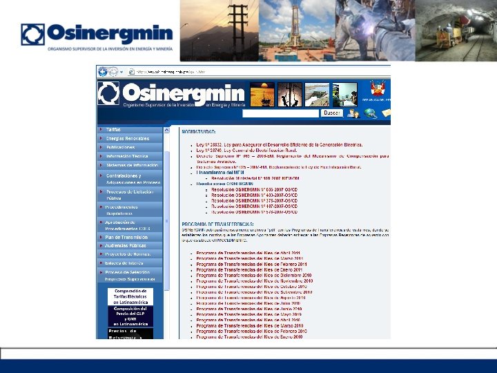 MARCO REGULATORIO (2 de 5) ● Decreto Supremo N° 025 -2007 -EM, Reglamento de la Ley General de Electrificación Rural (Mayo 2007) ● Resolución OSINERG N° 0001 -2003 -OS/CD, Procedimientos para Fijación de Precios Regulados (Enero 2003) ● Resolución OSINERGMIN N° 167 -2007 -OS/CD, Procedimiento de Aplicación del Mecanismo de Compensación para Sistemas Aislados (Abril 2007) ● Resolución Ministerial N° 101 -2010 -MEM/DM, Determinan Monto Específico para el Mecanismo de Compensación para Sistemas Aislados (Marzo 2010) ● La Norma "Procedimientos para Licitaciones de Suministro para Sistemas Aislados en el Marco de la Ley Nº 28832”, Resolución OSINERGMIN Nº 004 -2010 -OS/CD.