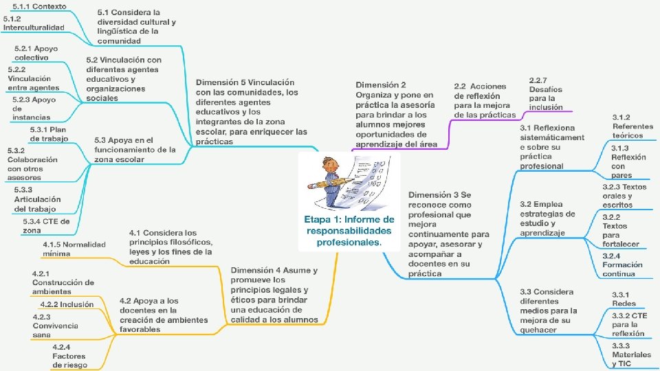 Etapas de la evaluación del desempeño Etapa 1. Informe de responsabilidades profesionales Énfasis: dimensiones 3, 4 y 5 Etapa 2. Proyecto de intervención del asesor técnico pedagógico Énfasis: dimensiones 1, 2 y 3 Etapa 3. Examen de conocimientos y habilidades para la asesoría técnica pedagógica Énfasis: dimensiones 1 y 4