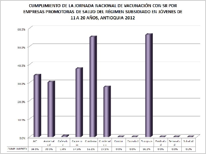 Cobertura de vacunación con Antigripal en los adultos de 60 y más años Subregión Nordeste 2012 40% 35% 30% 25% 20% 15% 10% 5% 0% Cobertura AMALFI ANORI CISNEROS REMEDIOS SAN ROQUE 31% 14% 19% 36% 39% SANTO DOMINGO 28% SEGOVIA VEGACHI YALI YOLOMBO 23% 27% 31% 25%