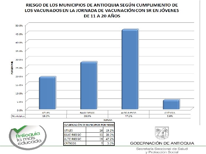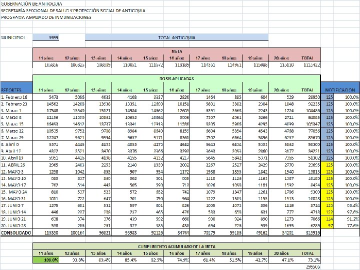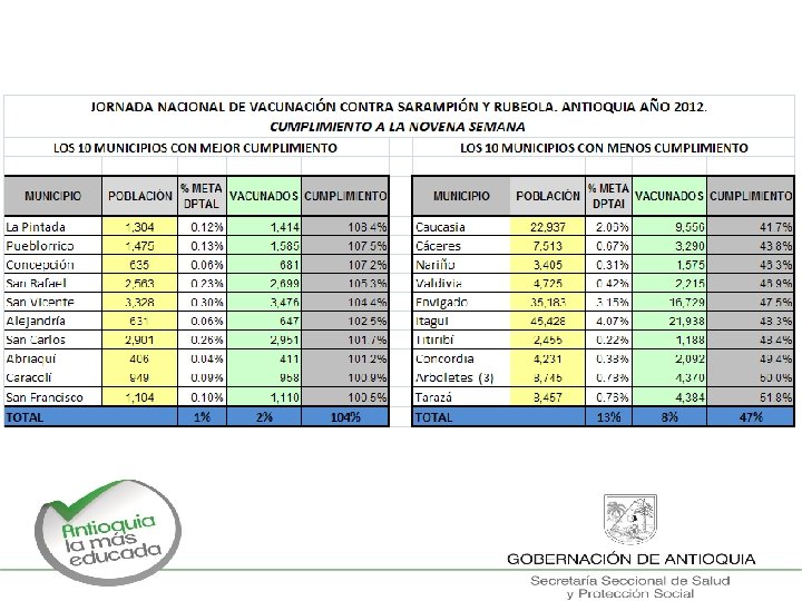 ACCIONES PARA FINALIZAR JNV SR ØVacunar con SR hasta la meta alcanzar. No cumplir la meta es perder el trabajo ya realizado. Genera deterioro de todos los compromisos: jornadas y programa permanente por el agotamiento del talento humano, incremento de costos, rutina, se olvida. ØDocumentar la vacunación en las instituciones educativas: censos de instituciones, alumnos matriculados y vacunados, faltantes o renuentes y sus causas. Esperado 100% de IE completamente vacunadas, mapas. ØDocumentar la vacunación en empresas, fabricas, lugares de concentración: censos de empresas, fabricas y otros lugares, personas censadas, vacunados, faltantes y/o renuentes y sus causas. Esperado 100% de entidades vacunadas, mapas. Ø Soporte de la vacunación casa a casa: en zona urbana y zona rural, micro planeación, mapas. ØEncuesta de cobertura de vacunación SR: según lineamiento publicado en la página web desde febrero 2012, con 95% o más soporta el cumplimiento de la JNV SR. ØÚltimos esfuerzos para cumplir con la meta. No se suspende la aplicación de SR debe haber disponibilidad de vacuna para los susceptibles y para el posible 5% que se encuentre en la encuesta de cobertura.