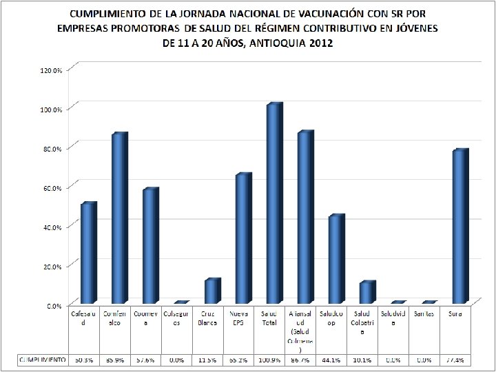 Cobertura de vacunación con Antigripal en los adultos de 60 y más años Subregión Oriente 2012 80% 70% 60% 50% 40% 30% 20% 10% ABEJO ALEJA ARGEL CARM COCO CONC GRAN GUAR GUAT LA LA MARI NARIÑPEÑOL RETIR RIONE SAN SAN SANT SONS RRAL NDRIA IA EN DE RNA EPCIO ADA NE APE CEJA UNIO NILLA O O GRO CARL FRAN LUIS RAFAE VICEN UARIO ON VIBOR N N OS CISCO L TE AL AL AB EJ OR RA L EJ AN DR CA IA RM AR EN GE LIA DE VI BO R CO AL CO RN CO A NC EP CI ON GR AN AD A GU AR NE GU AT AP E LA CE JA LA UN IO M AR N IN ILL A NA RI ÑO PE ÑO L RE TI RO RI ON EG SA RO N C SA AR N LO FR AN S CI SC O SA N LU SA IS N RA FA SA EL N VI CE NT SA E NT UA RI O SO NS ON 0% Cobertura 27% 46% 15% 29% 19% 40% 55% 31% 39% 18% 31% 75% 4% 51% 14% 35% 18% 43% 49% 19% 31% 36% 31%