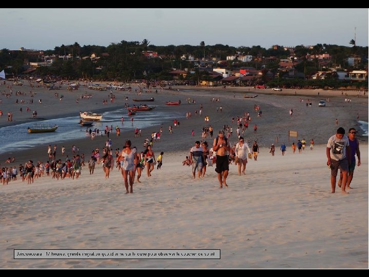 JERICOACOARA sympathique petite station balnéaire, familiale et sportive, relativement isolée et essentiellement fréquentée par des Brésiliens, qui se vide chaque soir vers 17 heures, moment où tous les vacanciers se précipitent pour un pèlerinage incontournable au sommet d’une grande dune de laquelle on admire le coucher du soleil !