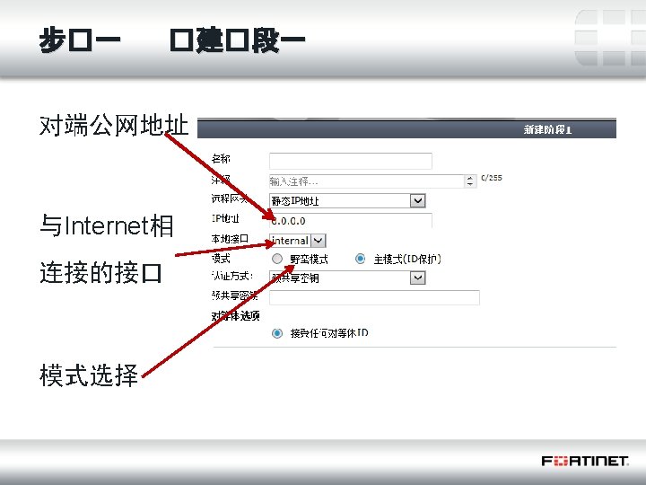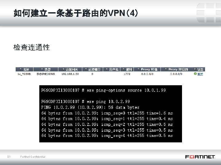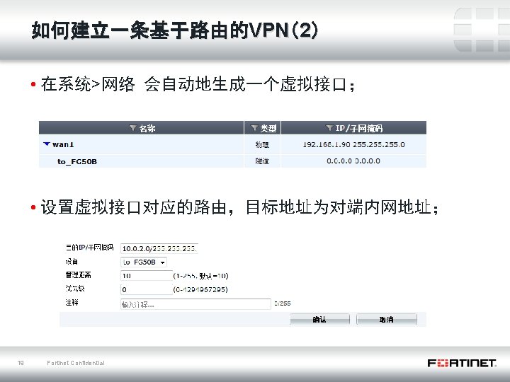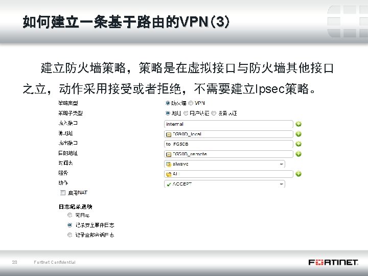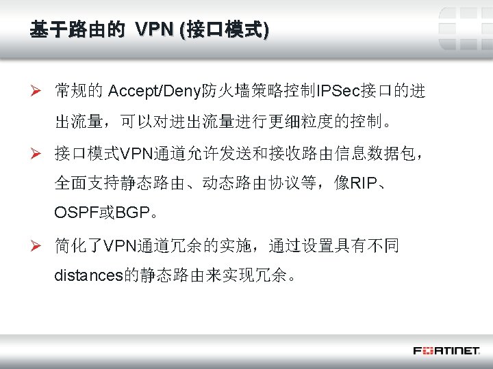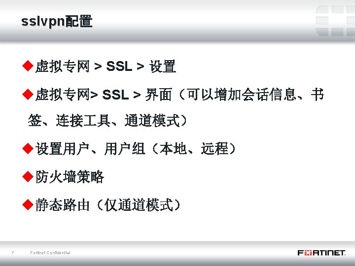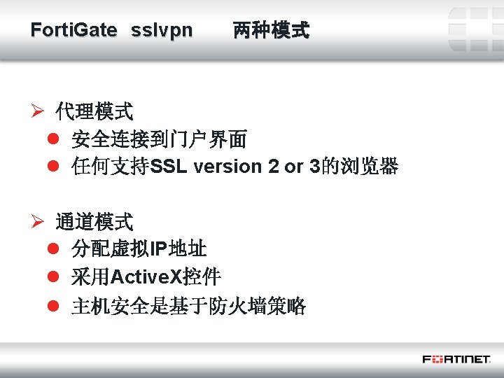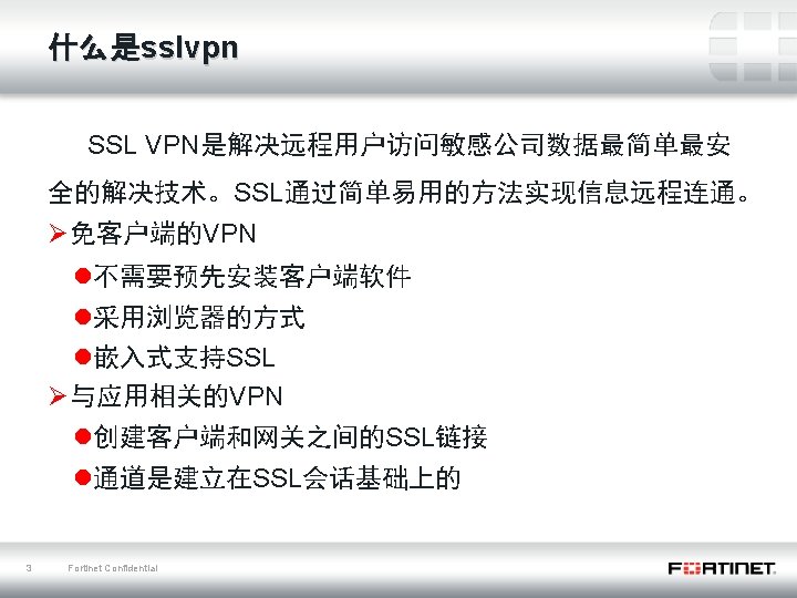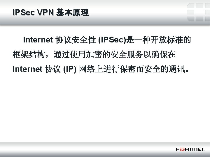 Forti Gate VPN sslvpnipsec vpn 1 Fortinet Confidential Slides: 22 Download presentation Forti. Gate VPN的实现及配置 ——sslvpn、ipsec vpn 1 Fortinet Confidential sslvpn 实现及配置 2 Fortinet Confidential Forti. Gate —— sslvpn网关 4 Fortinet Confidential Forti. Gate sslvpn��拓扑 user通过internet 拨入sslvpn,访问内网的服务 器。 lan: 10. 0. 100. 99 10. 0. 100. 88 192. 168. 1. 101 6 Fortinet Confidential wan: 192. 168. 1. 99 ipsecvpn 实现及配置 8 Fortinet Confidential Forti. Gate IPSec VPN �� 可以配置两种模式的IPSec VPN: Ø Policy-based VPN (Tunnel Mode) 基于策略的VPN,又叫通道模式的VPN。 Ø Routed-based VPN (Interface Mode) 基于路由的VPN,又叫接口模式的VPN。 10 Fortinet Confidential 基于策略的 VPN (通道模式) Site to Site VPN典型的网络拓扑: 11 Fortinet Confidential 步�一 13 Fortinet Confidential �建�段一 (高���) 步�二 14 Fortinet Confidential �建�段二 步�三 15 Fortinet Confidential 新建防火�策略 步�四 16 Fortinet Confidential ��通� �� 22 Fortinet Confidential