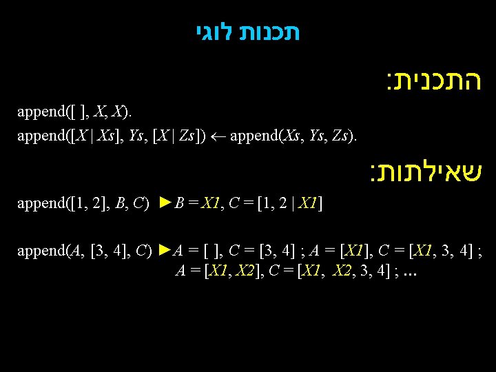 תכנות לוגי : עובדות append([1, 2], [3, 4], [1, 2, 3, 4]) append([ ], [a, b, c]) : התכנית append([ ], X, X). append([X | Xs], Ys, [X | Zs]) append(Xs, Ys, Zs). : שאילתות append(A, [3, 4], [1, 2, 3, 4]) ►A = [1, 2] append([1, 2], B, [1, 2, 3, 4]) ►B = [3, 4] append([1, 2], [3, 4], C) ►C = [1, 2, 3, 4]