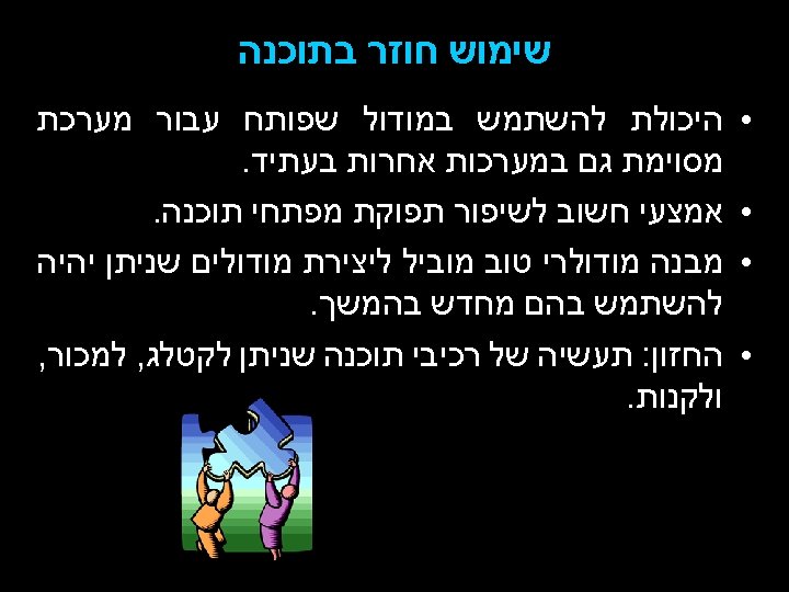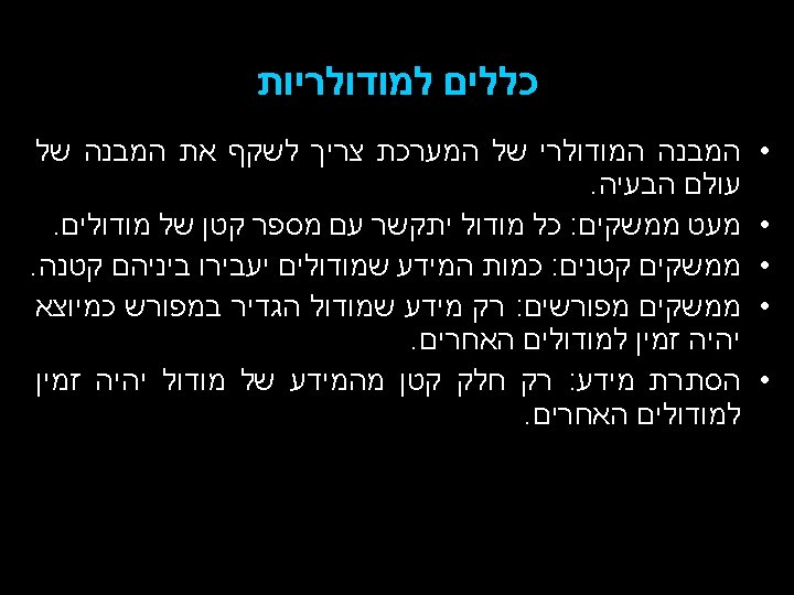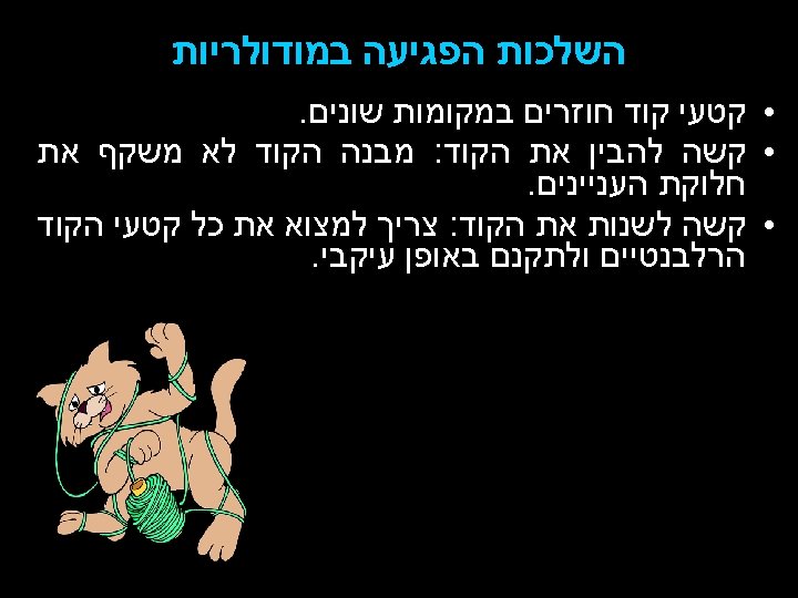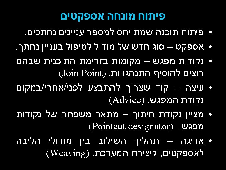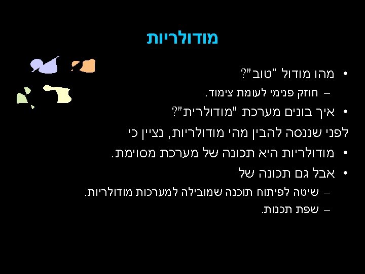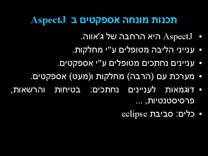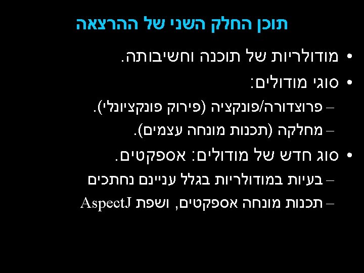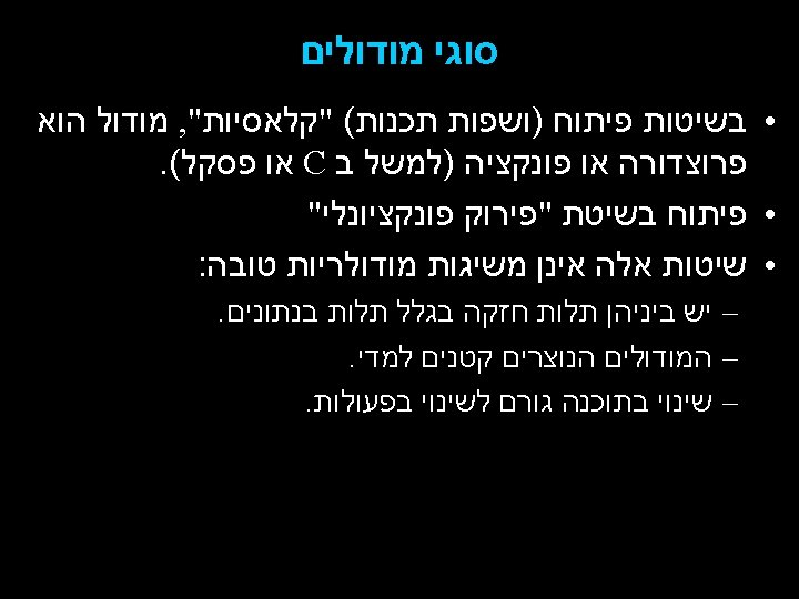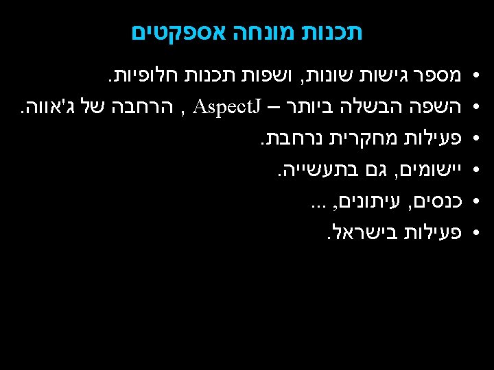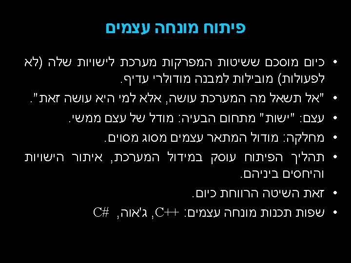 היסטוריה : תכנות מונחה עצמים Algol Simula C Smalltalk 1971 1958 Lisp 1958 1964 Ada C++ Java C# 1983 Flavors 1983 Eiffel 1995 2000 CLOS 1989 1986 1979
