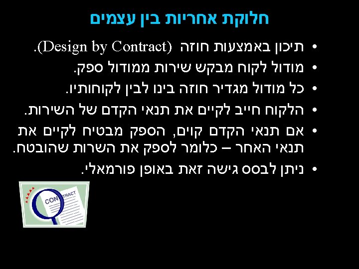 פעולות גנריות Operation Type Stack Queue item-stack item-queue put-stack put-queue remove-stack remove-queue count-stack count-queue Data-Directed Object-Oriented Dispatching Programming on (Message-Passing) Type