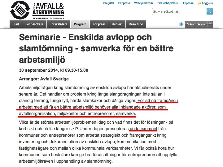 Samarbete miljö- och avfallssidan § Ha regelbundna möten där generella frågor och rutiner om enskilda avlopp diskuteras § Skapa rutiner för samarbete i enskilda ärenden § Avfallorg. rapportera avvikelser från slamtömningspersonalen till Miljö § Avsätt tillräckliga resurser för samarbete