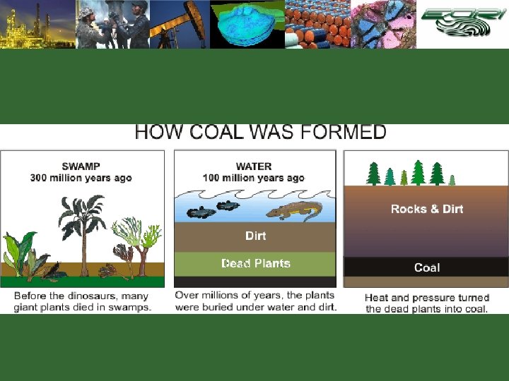 Fossil Fuels Oil – liquid hydrocarbon phase formed during burial between 70 and 120 C from kerogen. ¾ Natural Gas – hydrocarbons that are gaseous at earth surface conditions (C 1 -C 4) and formed by thermal degradation of kerogen or oil, or by microbial action near surface. ¾ Coal – Solid phase hydrocarbon formed from organic matter deposited in fresh water shallow environments (swamps). ¾