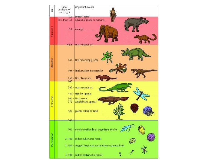 Period Date Main Fossils Quaternary 1. 8 to 10, 000 years mammals Tertiary 65 million years mammals Cretaceous 145 million years 1 st flowering plants Jurassic 200 million years Belemnites, Age of the Reptiles, first bird, archaeopteryx Triassic 250 million years Dinosaurs, plesiosaurs, ichthyosaurs 1 st mammals Permian 299 million years First reptiles, first shark Carboniferous 359 million years Ferns, club mosses, horsetails, first amphibian Devonian 418 million years Age of fishes Silurian 443 million years First fish and plants, crinoids Ordovician 488 million years Echinoids , earliest vertebrates, sea scorpion, ammonites Cambrian 542 million years Brachiopods, trilobites, graptolites, coral, bivalves, gastropods Pre-Cambrian 4530 million years Burgess Shale, stromatolites, jelly fish, worms etc. Origin of Earth