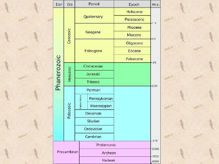 Geological Time • Earth has been around for a LONG time. – 4. 6 billion years, by our estimates • This time is divided up into sections called EONS. – Eons are broken up into ERAS. • Eras are broken down into PERIODS. – Periods are broken into EPOCHS and AGES. – Each of these sections lasts millions of years. – In order of length (from longest to shortest): eon > era > period > epoch (>) age
