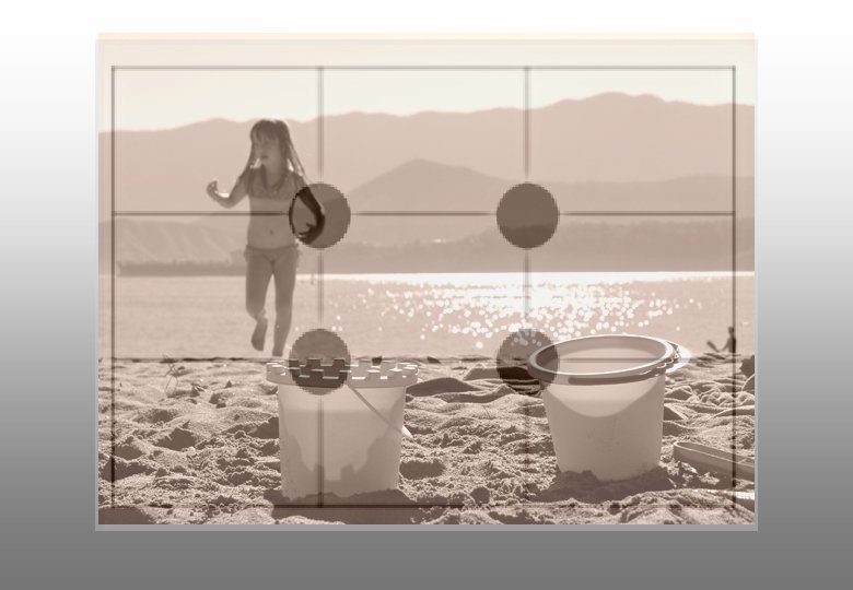 Os pontos de intersecção entre as linhas são os pontos chave ou os pontos de ouro, e por isso devem ser utilizados para situar os seus principais elementos. divida a área a ser fotografada em três terços iguais.
