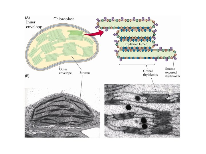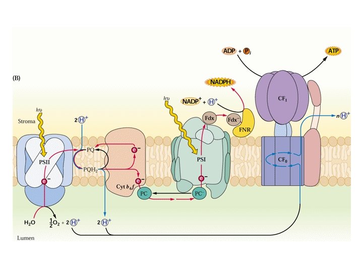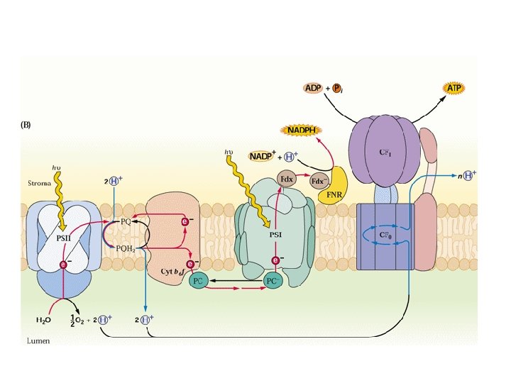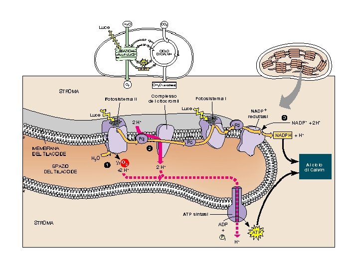 LA sintesi chemiosmotica di ATP Il movimento degli elettroni produce un gradiente di p. H tra lumen dei tilacoidi (acido) e stroma (basico) che viene utilizzato come fonte di energia per la sintesi di ATP nello stroma p = E -59 p. H