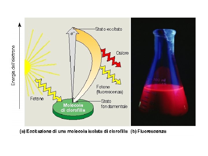 nel I stato eccitato la Chl è stabile per 10 -9 s FLUORESCENZA. La Chl emette un fotone e torna al suo stato basale CALORE. La Chl torna al suo stato basale senza emettere fotoni TRASFERIMENTO DI ENERGIA. La Chl trasferisce la sua energia ad un’altra molecola REAZIONE FOTOCHIMICA. L’energia dello stato eccitato viene utilizzata permettere che avvengano reazioni chimiche