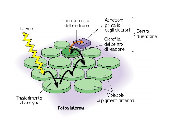 i sistemi antenna inviano l’energia ai centri di reazione 200 -300 molecole Chl per centro di reazione diverse centinaia di carotenoidi trasferimento di energia per risonanza il 99% dei fotoni assorbiti dai pigmenti antenna raggiunge il centro di reazione fotochimica