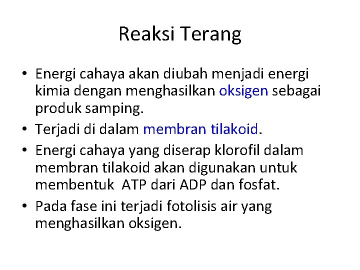 Reaksi Terang • Energi cahaya akan diubah menjadi energi kimia dengan menghasilkan oksigen sebagai produk samping. • Terjadi di dalam membran tilakoid. • Energi cahaya yang diserap klorofil dalam membran tilakoid akan digunakan untuk membentuk ATP dari ADP dan fosfat. • Pada fase ini terjadi fotolisis air yang menghasilkan oksigen.