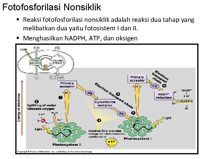 Aliran elektron Terdapat dua rute jalur elektron yang tersimpan pada akseptor elektron primer Dimulai dengan penangkapan energi foton Menggunakan rantai transport elektron dengan sitokrom untuk kemiosmosis Aliran elektron nonsiklik Menggunakan fotosistem II dan I Elektron dari fotosistem II dihilangkan diganti oleh elektron yang didonasikan oleh air Mensintesis ATP dan NADPH Donasi elektron mengkonversi air → O 2 dan 2 H+ Aliran elektron siklik Hanya menggunakan fotosistem I Elektron dari fotosistem I di-recycle Mensintesis ATP