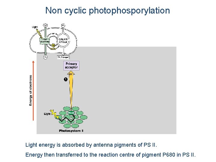 Non cyclic photophosporylation Light energy is absorbed by antenna pigments of PS II. Energy then transferred to the reaction centre of pigment P 680 in PS II.