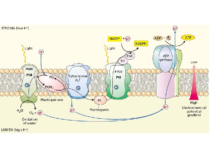 4. The electron is then transferred through plastoquinone, cytochrome complex, plastocyanin & PS I. As electron passed along ETC, they lose energy. The energy released is used to produced ATP 5. High energy electron in P 700 (PS I) is ejected, passes onto electron acceptor then to ferredoxin & NADP+ reductase 6. NADP+ reductase donates the electron to a molecule of NADP+ and stabilizes it by adding a proton to form NADPH is then released into the stroma.