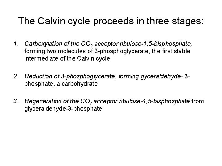 The Calvin cycle proceeds in three stages: 1. Carboxylation of the CO 2 acceptor ribulose-1, 5 -bisphosphate, forming two molecules of 3 -phosphoglycerate, the first stable intermediate of the Calvin cycle 2. Reduction of 3 -phosphoglycerate, forming gyceraldehyde- 3 phosphate, a carbohydrate 3. Regeneration of the CO 2 acceptor ribulose-1, 5 -bisphosphate from glyceraldehyde-3 -phosphate