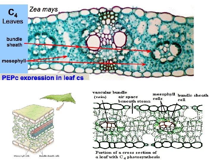 Anatomi daun C 4 dan jalur C 4 Photosynthetic cells of C 4 plant leaf Mesophyll cell Bundlesheath cell COCO 2 2 PEP carboxylase PEP (3 C) Oxaloacetate (4 C) ADP Vein (vascular tissue) Malate (4 C) ATP C 4 leaf anatomy Bundle. Sheath cell Pyruate (3 C) CO 2 Stoma CALVIN CYCLE Sugar Vascular tissue Pada tumbuhan C 4, seludang pembuluh – siklus Calvin proses fotosintesis