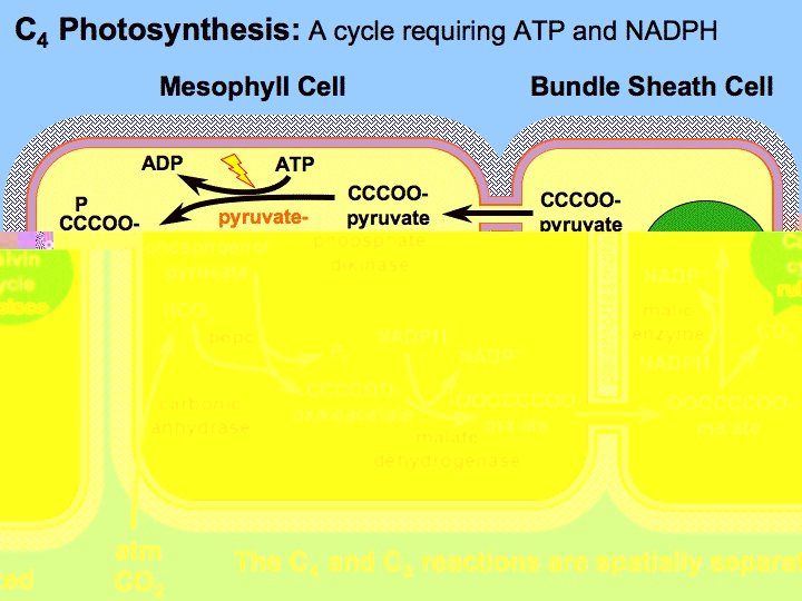 The basic C 4 cycle consists of four stages: 1. Fixation of CO 2 by the carboxylation of phosphoenolpyruvate in the mesophyll cells to form a C 4 acid (malate and/or aspartate) 2. Transport of the C 4 acids to the bundle sheath cells 3. Decarboxylation of the C 4 acids within the bundle sheath cells and generation of CO 2, which is then reduced to carbohydrate via the Calvin cycle 4. Transport of the C 3 acid (pyruvate or alanine) that is formed by the decarboxylation step back to the mesophyll cell and regeneration of the CO 2 acceptor phosphoenolpyruvate