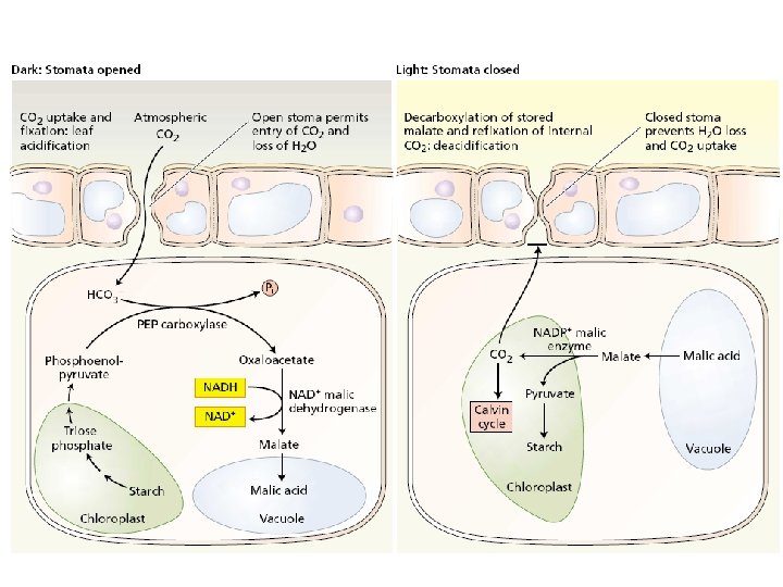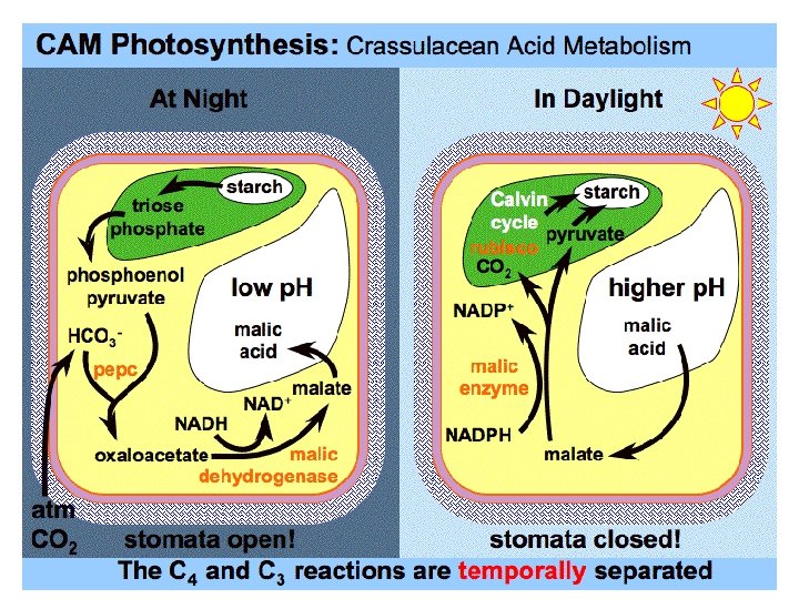 At night, • CAM plants take in CO 2 through their open stomata (they tend to have reduced numbers of them). • The CO 2 joins with PEP to form the 4 -carbon oxaloacetic acid. • This is converted to 4 -carbon malic acid that accumulates during the night in the central vacuole of the cells. In the morning, • the stomata close (thus conserving moisture as well as reducing the inward diffusion of oxygen). • The accumulated malic acid leaves the vacuole and is broken down to release CO 2. • The CO 2 is taken up into the Calvin (C 3) cycle. These adaptations also enable their owners to thrive in conditions of • high daytime temperatures • intense sunlight • low soil moisture.
