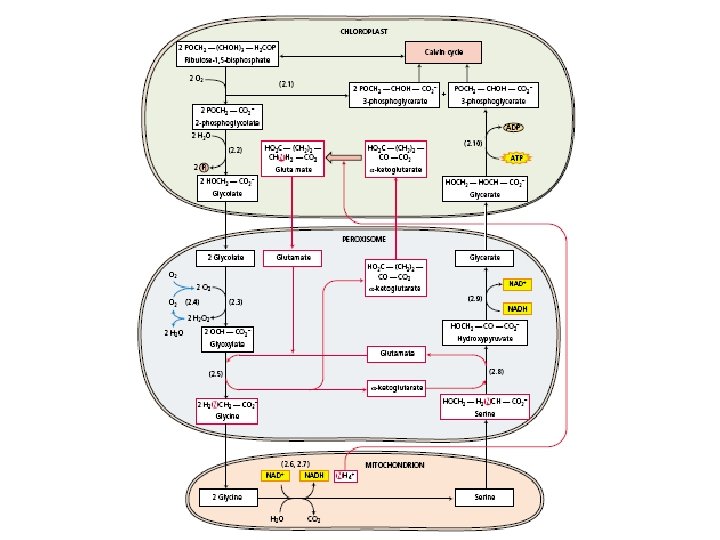 Siklus Calvin Light H 2 O Input 3 (Entering one CO 2 at a time) CO 2 NADP+ ADP CALVIN CYCLE LIGHT REACTION ATP Phase 1: Carbon fixation NADPH O 2 Rubisco [CH 2 O] (sugar) 3 P P Short-lived intermediate 3 P P 6 P Ribulose bisphosphate (Ru. BP) 3 -Phosphoglycerate 6 ATP 6 ADP CALVIN CYCLE 3 ADP 3 ATP Phase 3: Regeneration of the CO 2 acceptor (Ru. BP) 6 P P 1, 3 -Bisphoglycerate 6 NADPH+ 6 P P 5 (G 3 P) 6 P Glyceraldehyde-3 -phosphate (G 3 P) P 1 G 3 P (a sugar) Output Glucose and other organic compounds Phase 2: Reduction