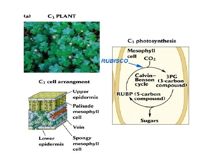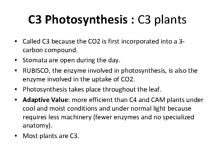 C 3 Photosynthesis : C 3 plants • Called C 3 because the CO 2 is first incorporated into a 3 carbon compound. • Stomata are open during the day. • RUBISCO, the enzyme involved in photosynthesis, is also the enzyme involved in the uptake of CO 2. • Photosynthesis takes place throughout the leaf. • Adaptive Value: more efficient than C 4 and CAM plants under cool and moist conditions and under normal light because requires less machinery (fewer enzymes and no specialized anatomy). • Most plants are C 3.