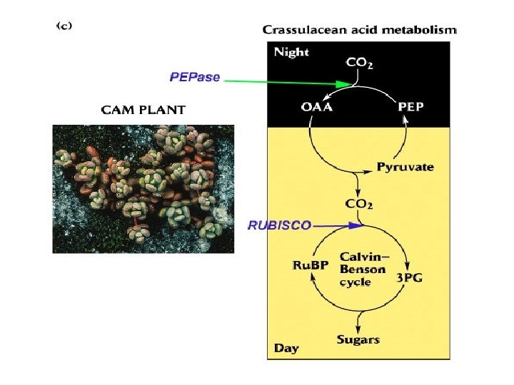Crassulacean acid metabolism (CAM) Temporal separation of CO 2 uptake from photosynthetic reactions: CO 2 uptake and fixation take place at night, and decarboxylation and refixation of the internally released CO 2 occur during the day. The adaptive advantage of CAM is the reduction of water loss by transpiration, achieved by the stomatal opening during the night. In both C 4 and CAM plants, PEP carboxylase is inhibited by malate and activated by glucose-6 -phosphate