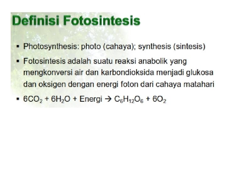 METABOLISME CAM § Pada umumnya terjadi pada daerah bersuhu tinggi dan kering § Meliputi 5% tanaman (sukulen dan anggota Crassulaceae) § Stomata menutup pada siang hari dan membuka pada malam hari - reaksi cahaya terjadi pada siang hari - fiksasi karbon (karboksilasi) terjadi pada malam hari (pada saat ada CO 2) • Contoh: pada tanaman kaktus, nanas
