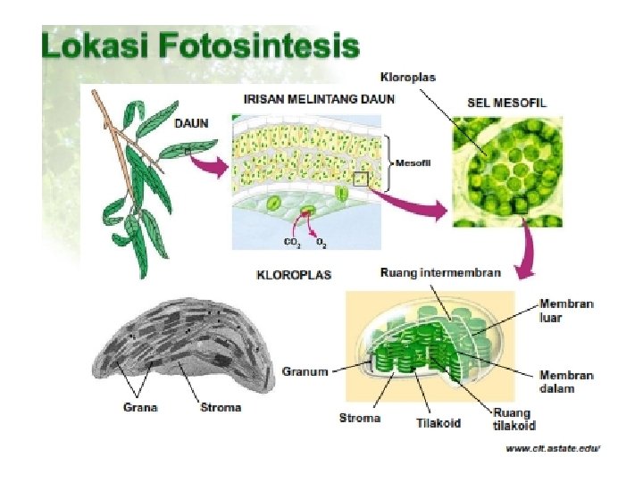 Lokasi Fotosintesis Stroma lamellae Tilakoid Membran luar Membran dalam Stroma (fase cair dalam kloroplas) basic image source: preuniversity. grkraj. org Granum (tumpukan tilakoid)