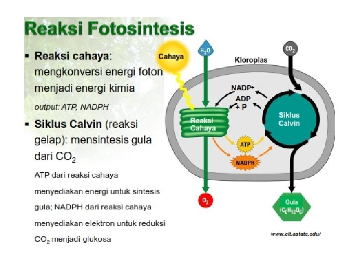 SIKLUS CALVIN § Siklus Calvin (reaksi gelap): lokasi di stroma kloroplas, § Proses yg terjadi: Sintesis CO 2 menjadi gula dengan bantuan enzim Rubisco (Ru. BP) § ATP dari reaksi terang menyediakan energi untuk sintesis gula; NADPH dari reaksi terang menyediakan elektron untuk reduksi CO 2 menjadi glukosa Cahaya Kloroplas NADP + P Reaksi Cahaya Siklus Calvin Gula www. clt. astate. edu/