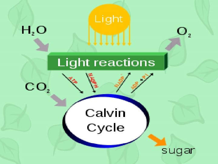 Calvin Cycle • • • Where does the Calvin Cycle occur? In the stroma What goes into the Calvin Cycle? ATP, NADPH, Carbon Dioxide What comes out of the Calvin Cycle? Sugar, ADP, NADP+