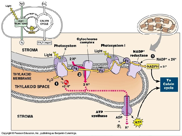 The production of ATP by chemiosmosis in photosynthesis Thylakoid compartment (high H+) Light Thylakoid membrane Antenna molecules Stroma (low H+) ELECTRON TRANSPORT CHAIN PHOTOSYSTEM II PHOTOSYSTEM I ATP SYNTHASE