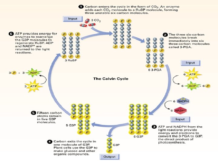 • regeneration of the CO 2 acceptor (Ru. BP), these five G 3 P molecules are rearranged to form 3 Ru. BP molecules. • cycle must spend 3 more molecules of ATP (one per Ru. BP) to complete the cycle and prepare for the next.