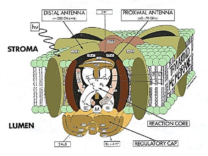 • La excitación del PS II crea un hueco electrónico que es llenado por otros componentes del PS II. • El núcleo de 4 átomos de Mn repone en forma secuencial el electrón a la Tyr • El núcleo de Mn repone sus 4 electrones desde el H 2 O P 680 + + Tyr P 680 + Tyr+ + Mn 0 Tyr + Mn+1 • Una Tyr de una proteína del complejo de escición del agua repone inicialmente el electrón al P 680+ Tyr+ + Mn+3 Tyr + Mn+4