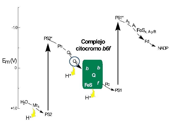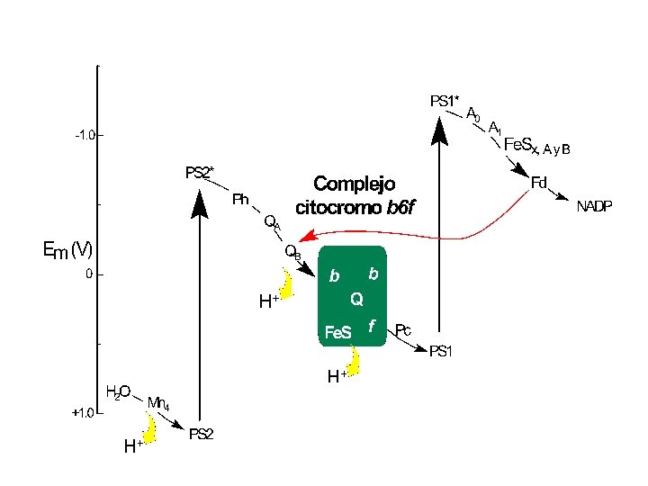 La PQ dona su electrón al complejo b 6 f es un complejo de 7 subunidades: • cit b 6 (2 hemos) • cit c (1 hemo c) • SU IV • Prot ferrosulfurada de Rieske (2 Fe-2 S) Este complejo transporta electrones al lumen.