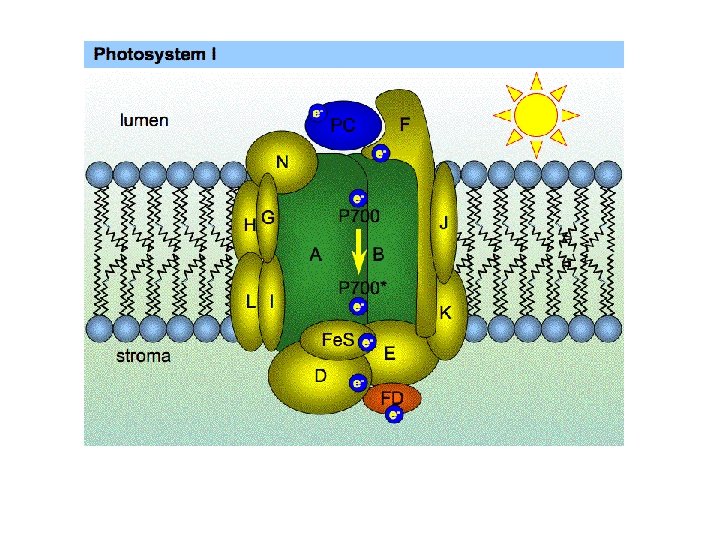 Transferencia de los electrones al NADP+ • El FS I de cianobacterias es un trímero, cada una de las unidades funcionales tiene 11 subunidades que coordinan + de 100 cofactores. • En eucariotas al menos 13 SU y 127 cofactores. • El centro de reacción contiene 6 Chl a y 2 filoquinonas (K 1). El dador primario, P 700, son 2 Chl a (A 1 y B 1) • La ferredoxina actúa como dador de electrones al NADP. Es una pequeña proteína de PM 17000.