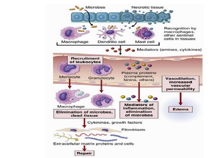2. List cells & molecules that play important roles in inflammation Inflammation is mediated by chemical substances called CHEMICAL MEDIATORS What is the source of these chemical mediators? 1. Phagocytes and other host cells Leukocyte Endothelium Mast cell 2. Plasma proteins