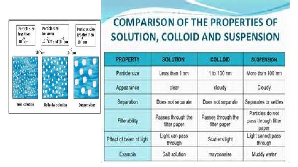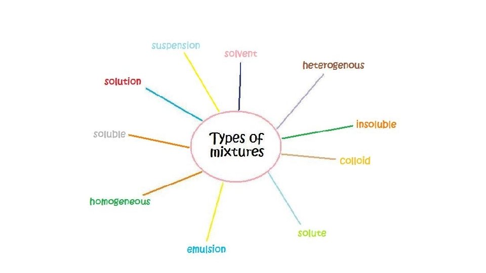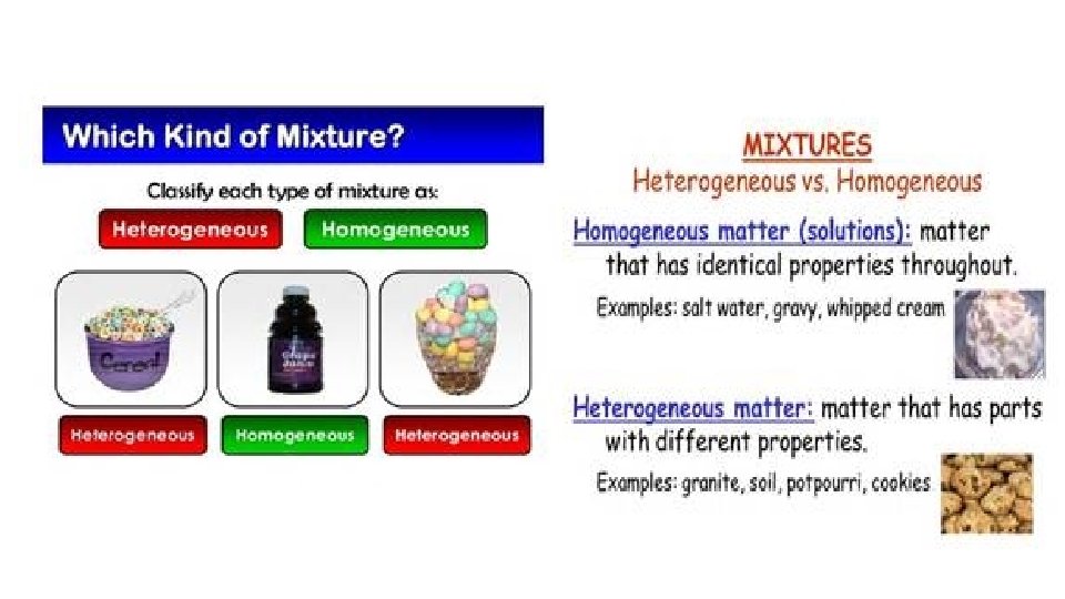 Mixtures HETEROGENEOUS-proportions of substance may vary -different materials can be identified - Particles settle in a suspension HOMOGENEOUS- Particles are too small to be seen with a microscope. - Particles never settle - They remain constantly mixed COLLOID-particles are larger than in solutions -Contains substances in varying proportions -particles will not settle Particles scatter light