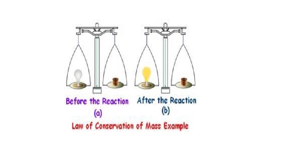 Law of Conservation of mass- mass of all substances present before a chemical change equals the mass of all substances after the change.